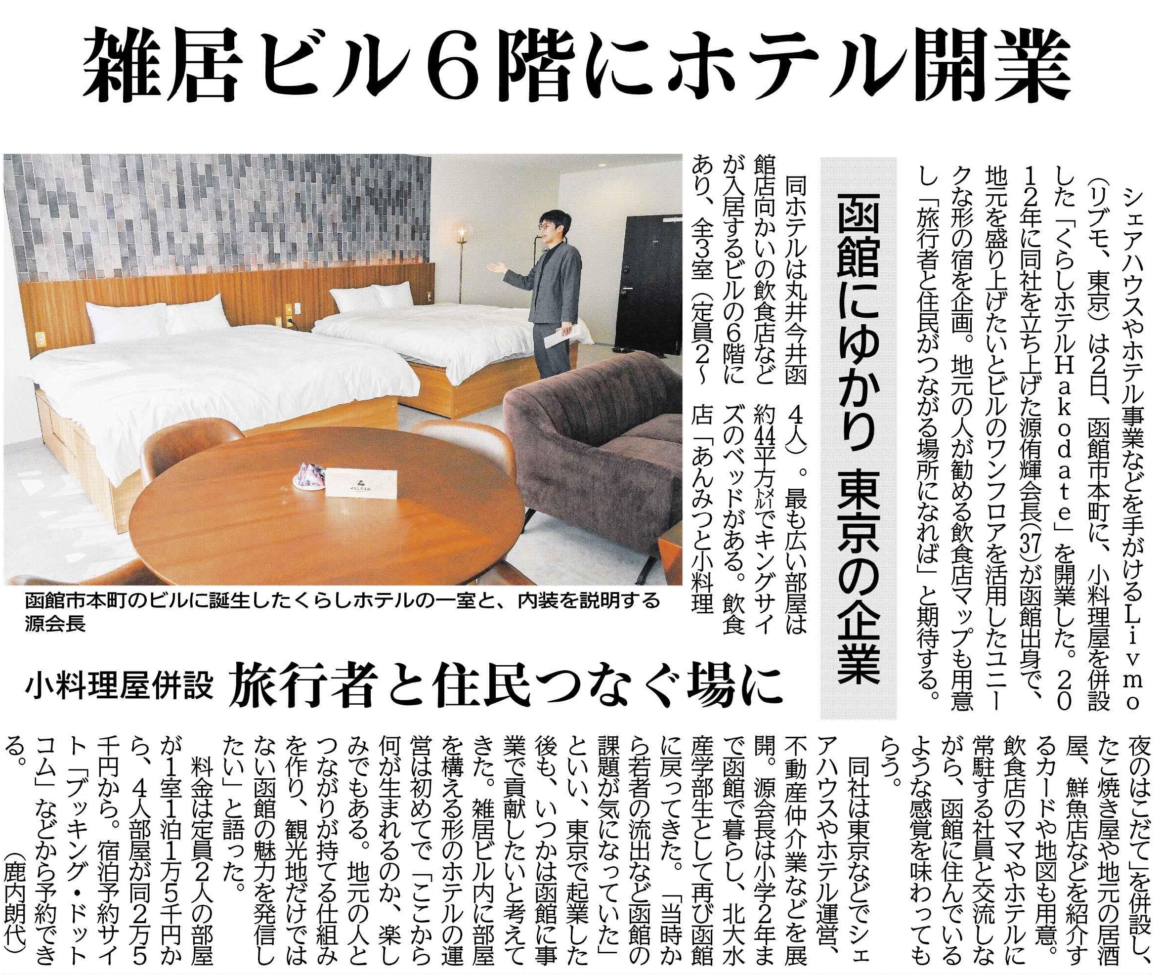 北海道新聞掲載【函館・五稜郭エリアに新ホテル 雑居ビル6階、小料理屋併設 旅行者と住民つなぐ】 北海道新聞にて、「くらしホテル Hakodate」の取材記事が掲載されました。観光地だけではない、函館の魅力を発信するための工夫についてお話しています。 Web版の記事はこちら
